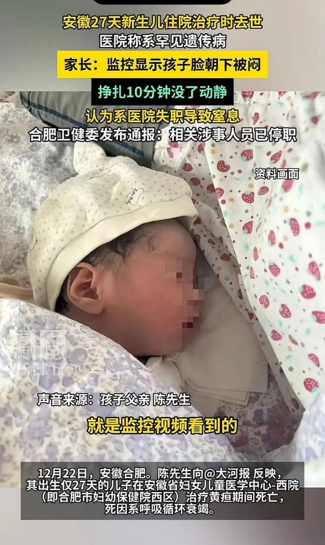 又一新生兒死亡!合肥,一新生兒黃疸住院治療,結(jié)果突然死亡。家長查看監(jiān)控后發(fā)現(xiàn),孩子竟然臉朝下被悶在床上掙扎了10分鐘,半小時(shí)后才被發(fā)現(xiàn),醫(yī)院一開始還想推卸責(zé)任稱系遺傳病致危!網(wǎng)友:孩子是來治病的,結(jié)果在醫(yī)院丟了命,太讓人痛心了! 陳先生...